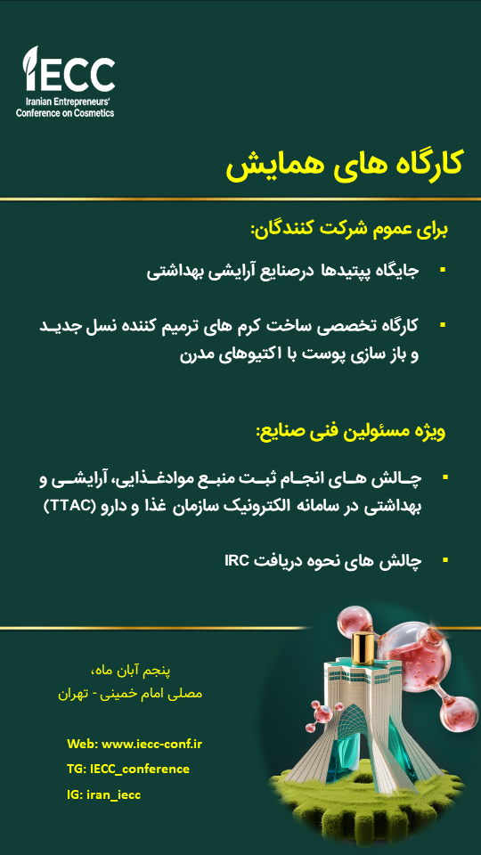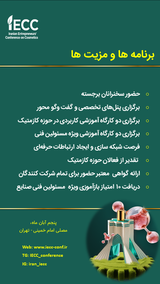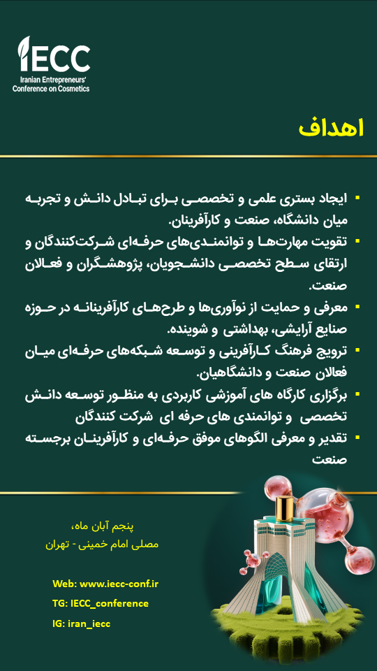 🔹 ایجاد بستر همکاری‌های ملی و بین‌المللی برای ارتقای جایگاه ایران در بازارهای منطقه‌ای و جهانی صنعت آرایشی و بهداشتی.